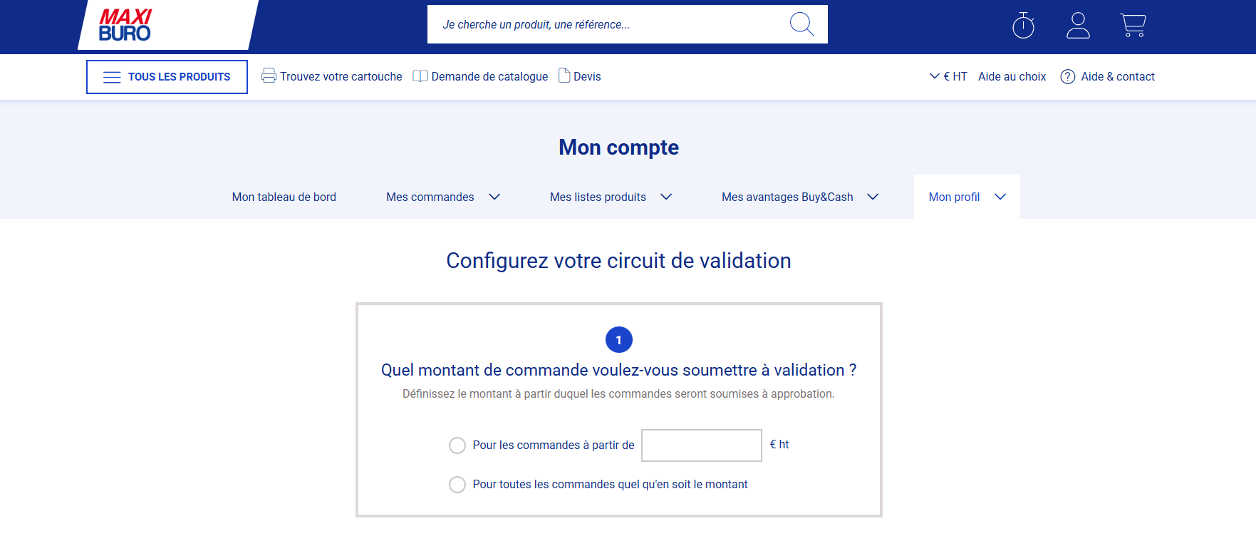 Etape 1 : Définissez quelles commandes seront soumises à validation (montant minimum ou toutes les commandes). Vous avez la possibilité de paramétrer un circuit de validation par personne avec des critères différents.
