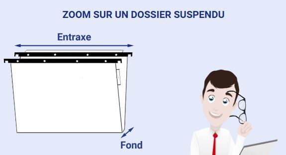 L'entraxe correspond à l'écart séparant les crochets d'un dossier suspendu. Cela correspond également à l'écart entre les rails de votre tiroir ou de votre armoire de classement. Il est généralement de 33 cm, mais notez qu'il en existe aussi de 39 cm. Pensez donc à mesurer l'entraxe des rails de vos tiroirs ou de vos armoires avant tout achat.