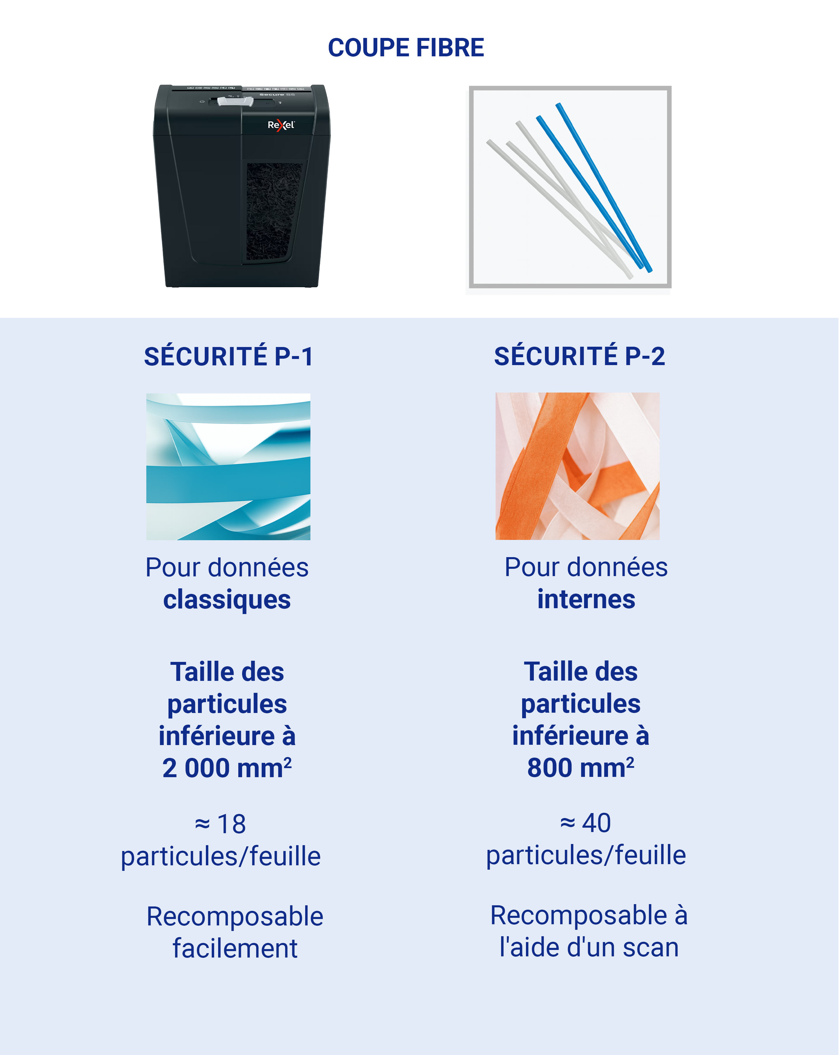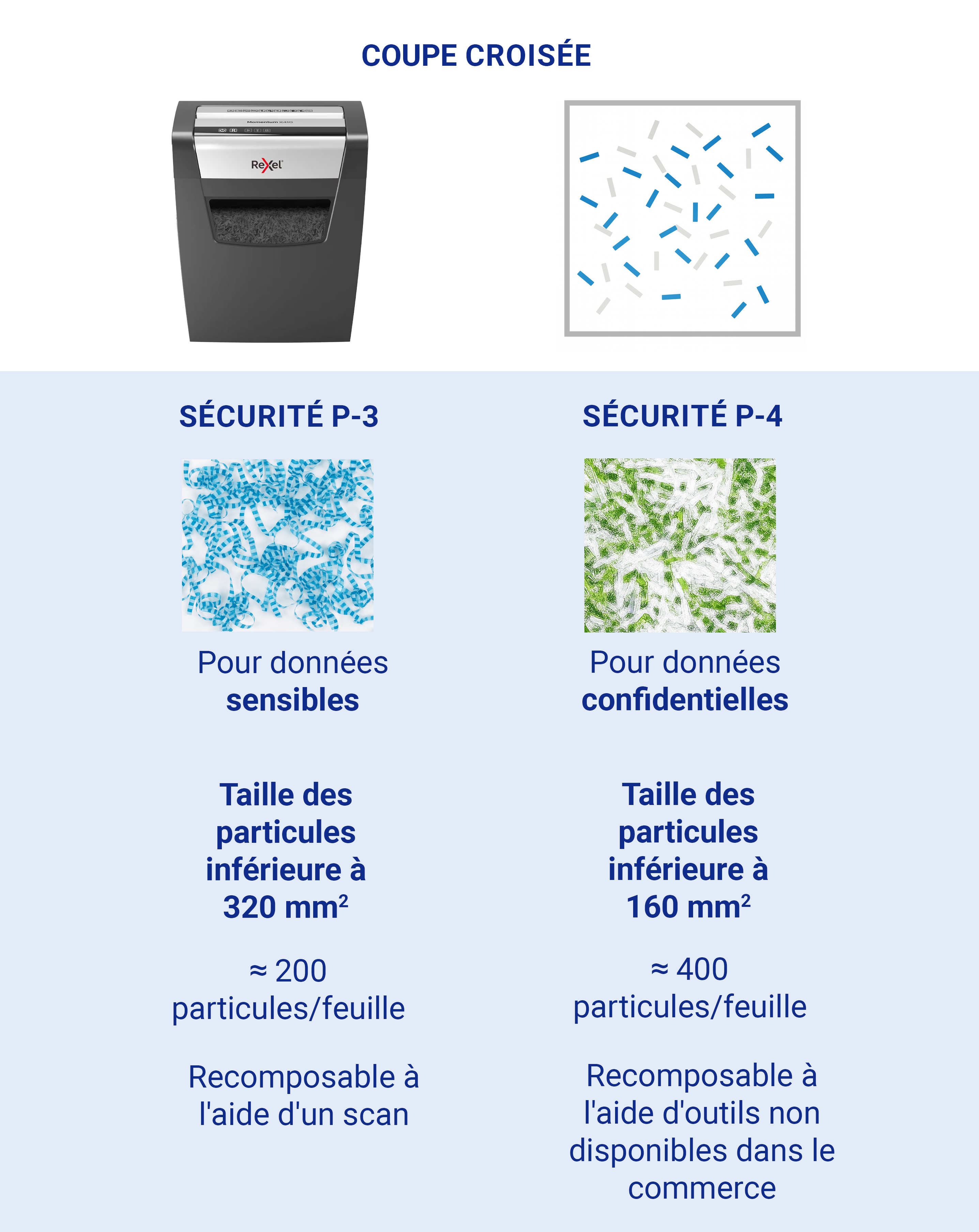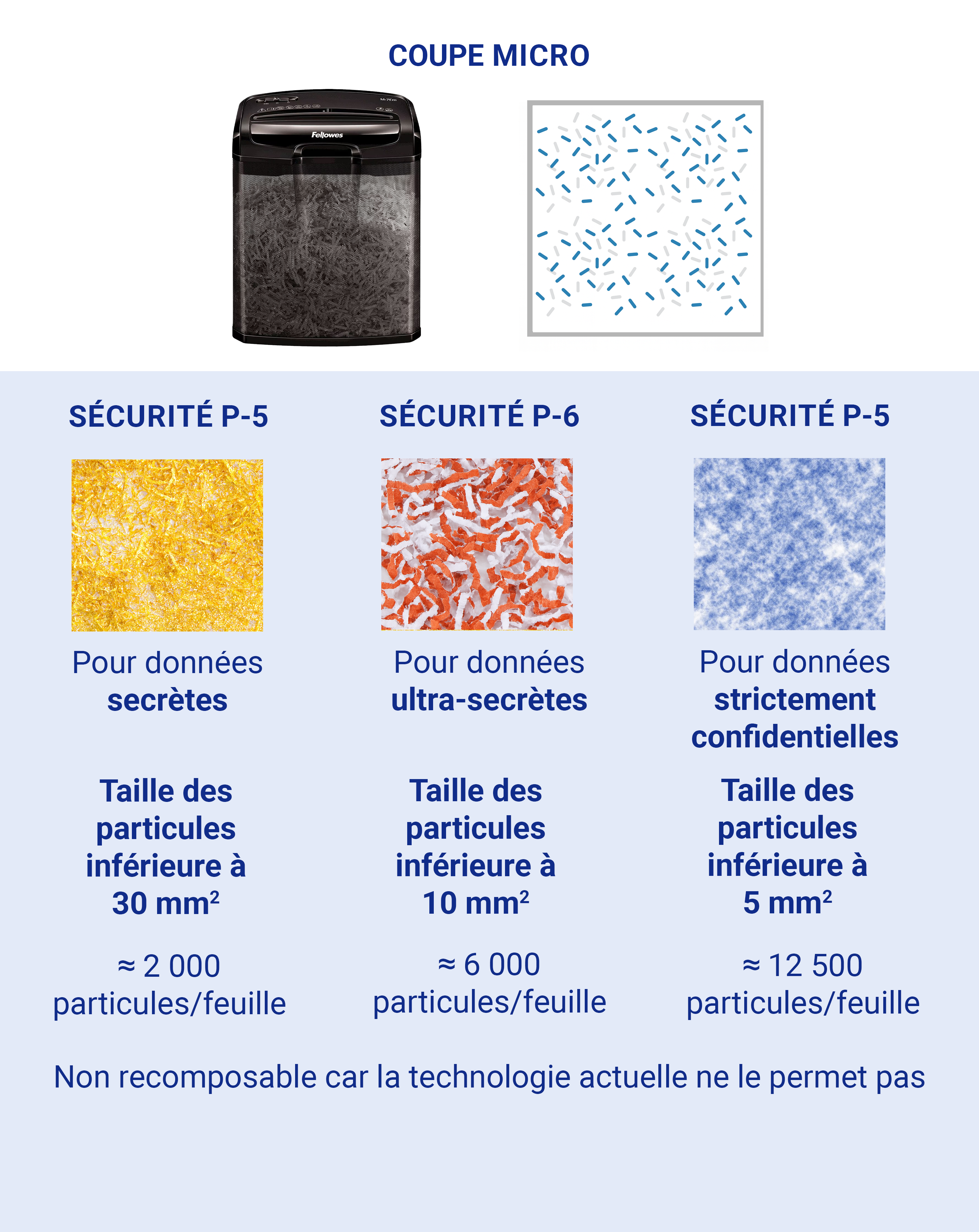 On compte 7 niveaux sur l'échelle de confidentialité de la norme internationale DIN, du plus basique DIN P-1 au plus performant DIN P-7 (le niveau de sécurité minimum pour être conforme au RGPD est le niveau DIN P-4). À chaque niveau de sécurité correspond une taille de coupe. Plus le niveau de sécurité est élevé, plus la taille des particules générées par le destructeur sera réduite.