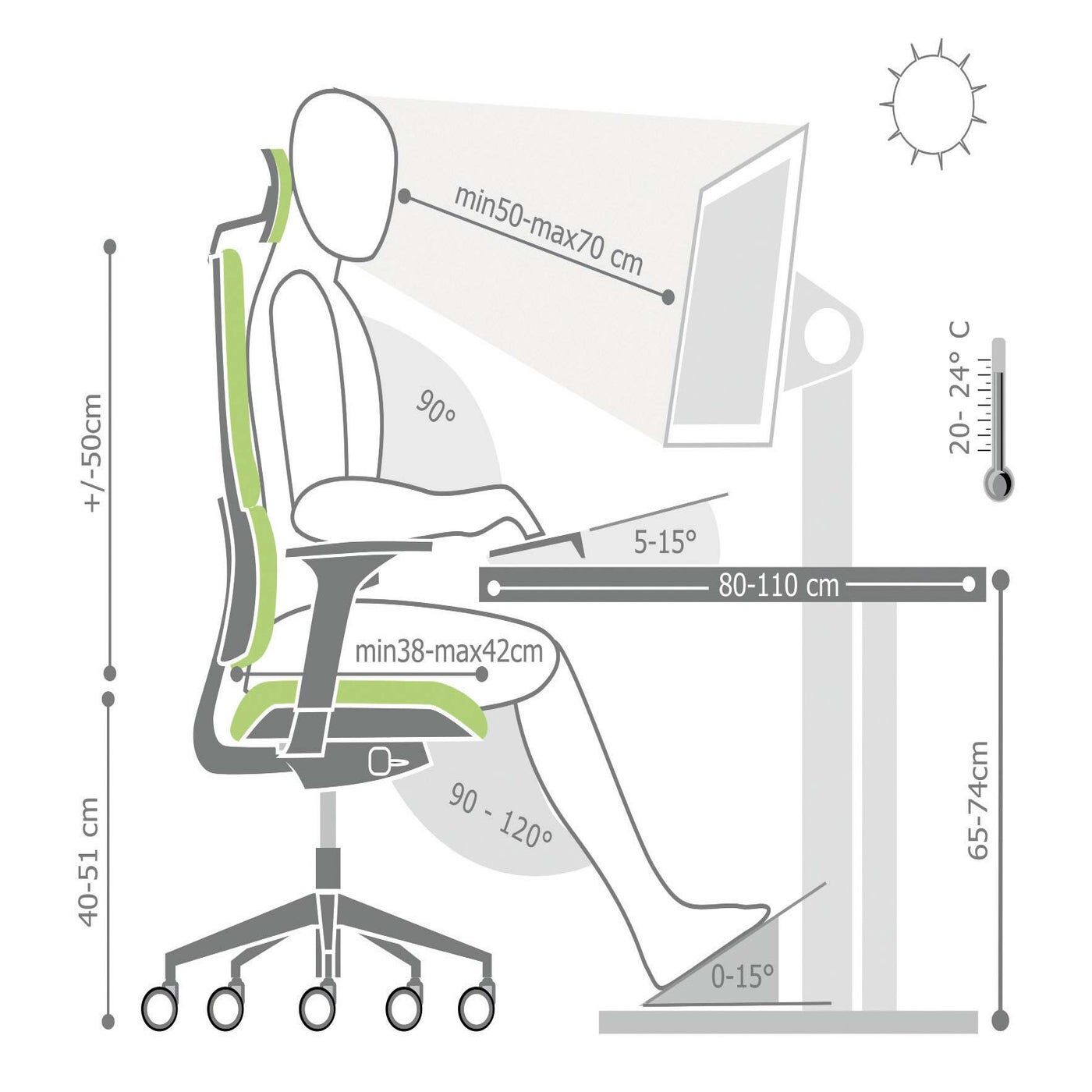 Bras : à l'horizontale sur les accoudoirs, parallèlement à la surface du bureau. Les coudes ne s'écartent pas trop du corps, de manière à former un angle droit. Les poignets, eux, doivent se positionner dans le prolongement des coudes.