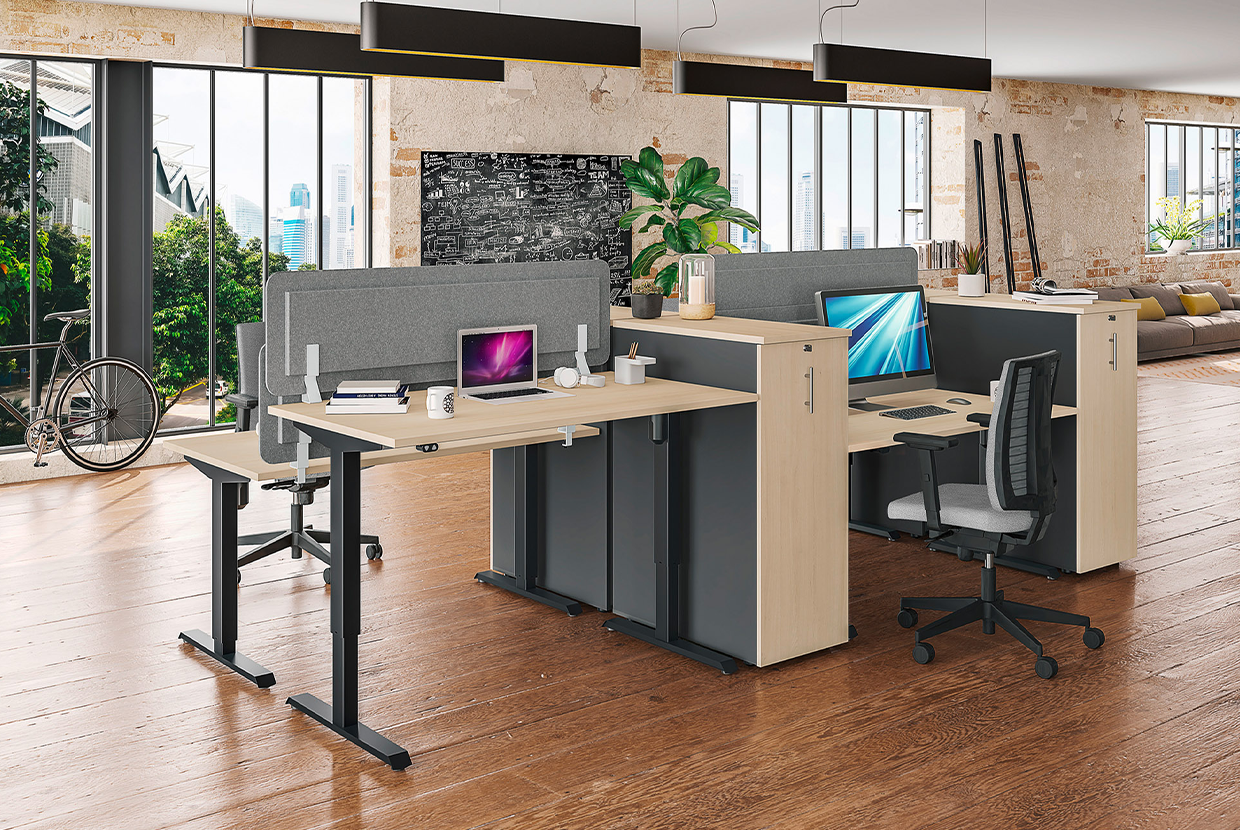 Bureaux avec 4 positions mémorisables, panneau de contrôle avec ports USB-A et USB-C et système de sécurité anti collision.