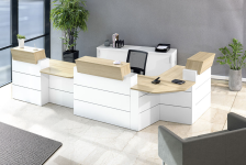 Des structures droites et d’angles sont proposées selon les besoins. Des modules bas permettent d’accueillir les personnes à mobilité réduite. Plateaux coloris chêne clair.