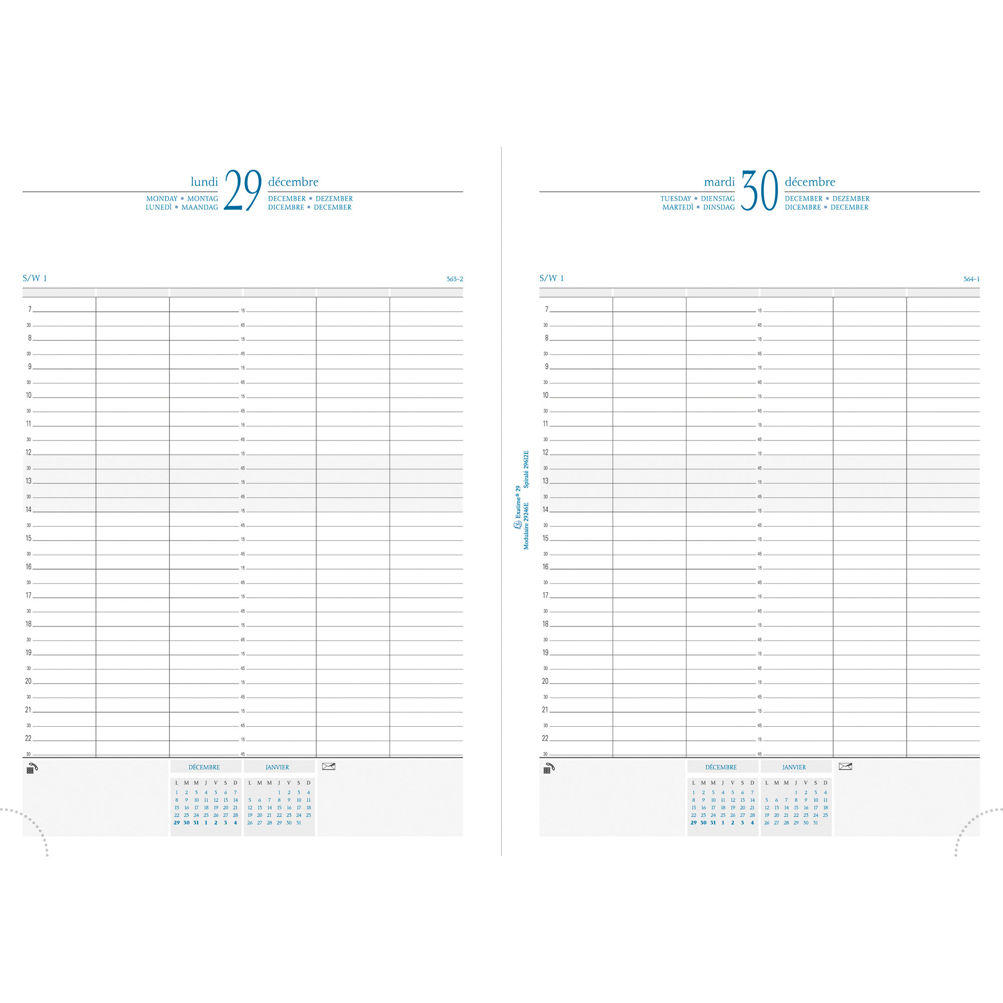 Agenda de Janvier à Décembre. Couverture noire, papier blanc certifié PEPC, répertoire. Consultation : RDV par 1/4h.1 jour sur 1 page, grille précise au 1/4 d’heure ; de 7h à 22h30. Journal 29/1 : pour gérer 3 à 6 utilisateurs. 29,7 x 21 cm.