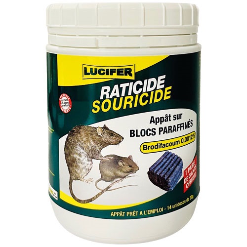 L'appât bloc rats et souris en 280 g de chez Lucifer contient 0.0012% de brodifacoum. Prêt à l'emploi en sachet unidose vendu dans un pot plastique refermable. Les blocs sont paraffine Suivre les consignes d'utilisation, port de gants. Mettre les appâts à l'intérieur d'une boite à appâts pour la sécurité des humains et des animaux. La gamme des produits souricide, raticide proposés par Lucifer est une sélection de produits spécialement formulés pour éliminer les souris et les rats, deux nuisibles courants qui peuvent causer des problèmes dans les environnements domestiques, commerciaux et industriels. Ces produits sont conçus pour être efficaces, pratiques et sécuritaires lorsqu'ils sont utilisés conformément aux instructions. Voici une description détaillée de la gamme souricide, raticide. Formules efficaces, la gamme souricide, raticide propose une variété de formulations puissantes conçues pour attirer et tuer les souris et les rats. Ces formules peuvent être sous forme de granulés, de poudres, de blocs ou de liquides, chacune offrant une méthode d'application spécifique pour cibler les nuisibles.