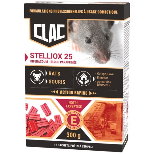 L'appât bloc Strelliox 25 rats et souris action rapide en boite de 300 g de chez Clac est un Bloc paraffiné rodenticide contenant 0.0025% p/p difenacoum. Cet appât sous forme de blocs, en sachets individuels prêts à l’emploi, est idéal pour le traitement des zones humides (cave, garage, entrepôt ou abords du bâtiment). Ces blocs résitants à l’humidité sont riches en aliments (farine, céréales,…) et particulièrement appréciés par les rongeurs qui aiment ronger les arrêtes saillantes. Conseil d'utilisation, retirer toute nourriture facilement accessible pour les rongeurs (par exemple, des céréales éparpillées ou des déchets alimentaires). Par ailleurs, ne pas nettoyer la zone infestée juste avant le traitement car cela perturbe la population des rongeurs et rend l’acceptation de l’appât plus difficile. Le produit doit être utilisé dans des postes d’appâtage sécurisés (ne pas ouvrir les sachets contenant l’appât) à placer à proximité immédiate de l’endroit où l’activité de rongeurs a été observée (par exemple, parcours, sites de nidification, parcs d’engraissement, trous, terriers, etc.) et doivent, si possible, être fixés au sol ou à d’autres structures. L’utilisation de ce produit devrait permettre d’éliminer les rongeurs sous 35 jours. Conserver le produit dans un endroit sec, frais et bien ventilé. Maintenir le contenant bien fermé et à l’abri de toute exposition directe au soleil. Dosage, contre souris (Mus musculus), usage intérieur uniquement: 30 g d’appât par