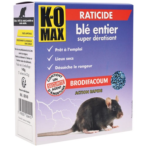L'appât céréales raticide au blé entier super dératissant en boite de 140 g de chez K-OMAX est très efficace contre les rongeurs résistant aux anticoagulants classiques. De plus cet appât présente un traitement à coeur indispensable pour lutter efficacement contre les rats. Agit avec un effet retard et n’éveille pas la méfiance des rongeurs. Ils s’affaiblissent, s’éloignent de la colonie, se cachent et meurent en quelques jours. La matière active participe au dessèchement du rongeur et évite ainsi les fortes odeurs de putréfaction. Manipuler avec des gants pour éviter de transmettre l’odeur de l’homme. Déposer de préférence les sachets doses dans les cachettes accessibles seulement aux rongeurs. Appâter jusqu’à ce que la consommation cesse. Bien refermer la boîte après chaque utilisation. Il est prêt à l’emploi (sachets-doses). Sans odeur. Spécial lieux humides. La boite en plastique est refermable, le couvercle est inviolable.