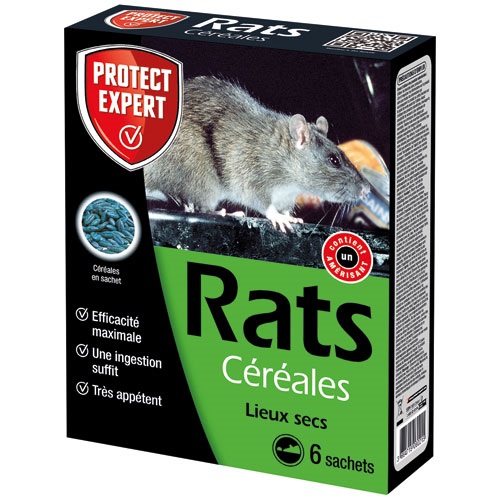 L'appât céréales rats en 150 g de chez Protect Expert est un rodenticide très appétent qui permet l’élimination de la plupart des rongeurs : rats noirs, surmulots, rats d’égouts et souris domestiques. Il se présente sous la forme de sachets prêt à l’emploi doté d’une excellente appétence sans risque de dispersion. Il est utilisé dans les lieux comme les caves, locaux d’élevage, basse-cours, entrepôts. Avant le traitement , retirer toute nourriture facilement accessible pour les rats (par exemple, des céréales éparpillées ou déchets alimentaires.). Positionnement des appâts, choisissez la sécurité en adoptant les boîtes appâts fermées à clé ! Leur utilisation est obligatoire et protège les appâts pour procurer aux rats un sentiment de sécurité et éviter que d’autres animaux ne consomment les appâts. Positionnez les appâts prêt-à-l’emploi en sachets (ne pas ouvrir les sachets) dans des postes d’appâtage sécurisés et convenablement étiquetés. Les postes d’appâtage doivent être placés à proximité immédiate de l’endroit où l’activité des rats a été observée (par exemple, parcours, sites de nidification, parcs d’engraissement, trous, terriers etc.) et si possible être fixés au sol ou à d’autres structures. En début de traitement, les postes d’appâtage doivent être inspectés tous les 5 à 7 jours, puis 1 fois par semaine pour vérifier si l’appât est consommé. Le délai d’apparition de l’effet anticoagulant est de 4 à 10 jours après ingestion de l’appât.