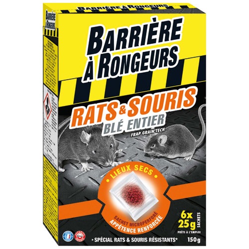 L'appât céréales rats et souris blé entier en 150 g de chez Barrière à Rongeurs est un sachet d'appât sur blé entier prêts à l’emploi destinés à éliminer les rats et souris dans les lieux secs : habitation, grenier, dépendance. Processus de fabrication par turbo imprégnation assurant une répartition homogène de la matière active, la diféthialone, sur le grain de blé, ce qui apporte une très haute appétence de l'appât même en cas de concurrence alimentaire. N’éveille pas la méfiance des rongeurs. Les plus du produit, spécial Rats et Souris résistants, anticoagulant de dernière génération, la diféthialone, agit entre 1 et 21 jours après ingestion sans éveiller la méfiance des autres rongeurs. Sachet microperforé de 25 g. Aucune résistance constatée à ce jour. Dose d'emploi, pour les souris, jusqu'à 2 sachets de 25 g soit 50 g à disposer tous les 1 m. Pour les rats : jusqu'à 6 sachets de 25 g soit 150 g à disposer tous les 4 m.