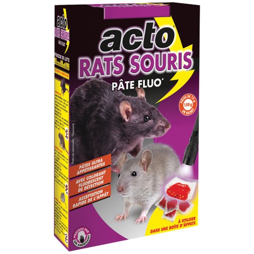 L'appât pâte fluo rats et souris en 150 g de chez Acto, est une pâte appât fluorescente souricide et raticide . Une efficacité professionnelle, une association de la technologie PASTA PLUS et de la FLUORESCENCE. La technologie PASTA PLUS est un ajout de céréales dans la formulation de la pâte appât pour une appétence renforcée et pour stimuler sa consommation. La FLUORESCENCE est quelque chose de familier et sans danger, réduit la néophobie chez les rongeurs et leur fait consommer l’appât plus vite. Des essais réalisés en conditions réelles dans les locaux infestés ont montré jusqu’à 2,5 fois plus de préférence pour l’appât fluorescent comparé au même appât non fluorescent. L'appât prêt à l’emploi à utiliser dans des boîtes d’appâts sécurisées. Doses et fréquences d’application contre les souris à l’intérieur uniquement, jusqu’à 50 g d’appât par poste d’appâtage espacés de 2 mètres (forte infestation) ou de 5 mètres (faible infestation). Contre les rats à l’intérieur et à l’extérieur autour des bâtiments : jusqu’à 100 g d’appât par poste d’appâtage espacés de 5 mètres (forte infestation) ou de 10 mètres (faible infestation). Placer les postes d’appâtage dans des endroits qui ne risquent pas d’être inondés. Remplacer tout appât qui a été altéré par l’eau ou contaminé par des saletés. Les stations d’appâtage doivent être inspectées que 5 à 7 jours après le début du traitement (contre les rats) ou au minimum tous les 2 à 3 jours au début du traitement (contre les souris), puis au moins une fois par semaine par la suite, dans le but de vérifier si l’appât est accepté et si les postes d’appâtage ne sont pas altérés et de retirer les cadavres de rongeurs. Recharger le poste d’appâtage si besoin. Délai nécessaire pour l’apparition de l’effet biocide, en raison de leur mode d’action retardé, les rodenticides anticoagulants agissent entre 4 et 10 jours après consommation de l’appât.