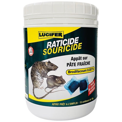 L'appât pâte fraiche rats et souris en 150 g de chez Lucifer contient 0.001% de brodifacoum. Prêt à l'emploi en sachet unidose vendu dans un pot plastique refermable. Suivre les consignes d'utilisation, port de gants. Mettre les appâts à l'intérieur d'une boite à appâts pour la sécurité des humains et des animaux. La gamme des produits souricide, raticide proposés par Lucifer est une sélection de produits spécialement formulés pour éliminer les souris et les rats, deux nuisibles courants qui peuvent causer des problèmes dans les environnements domestiques, commerciaux et industriels. Ces produits sont conçus pour être efficaces, pratiques et sécuritaires lorsqu'ils sont utilisés conformément aux instructions. Voici une description détaillée de la gamme souricide, raticide. Formules efficaces, la gamme souricide, raticide propose une variété de formulations puissantes conçues pour attirer et tuer les souris et les rats. Ces formules peuvent être sous forme de granulés, de poudres, de blocs ou de liquides, chacune offrant une méthode d'application spécifique pour cibler les nuisibles.