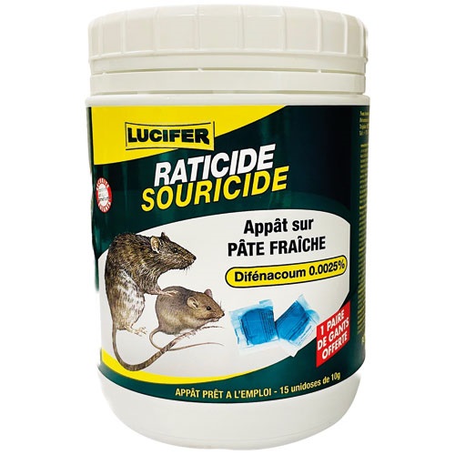 L'appât pâte fraiche rats et souris en 150 g de chez Lucifer contient 0.0025% de difénacoum. Prêt à l'emploi en sachet unidose vendu dans un pot plastique refermable. Suivre les consignes d'utilisation port de gants. Mettre les appâts à l'intérieur d'une boite à appâts pour la sécurité des humains et des animaux. La gamme des produits souricide, raticide proposés par Lucifer est une sélection de produits spécialement formulés pour éliminer les souris et les rats, deux nuisibles courants qui peuvent causer des problèmes dans les environnements domestiques, commerciaux et industriels. Ces produits sont conçus pour être efficaces, pratiques et sécuritaires lorsqu'ils sont utilisés conformément aux instructions. Voici une description détaillée de la gamme souricide, raticide. Formules efficaces, la gamme souricide, raticide propose une variété de formulations puissantes conçues pour attirer et tuer les souris et les rats. Ces formules peuvent être sous forme de granulés, de poudres, de blocs ou de liquides, chacune offrant une méthode d'application spécifique pour cibler les nuisibles.
