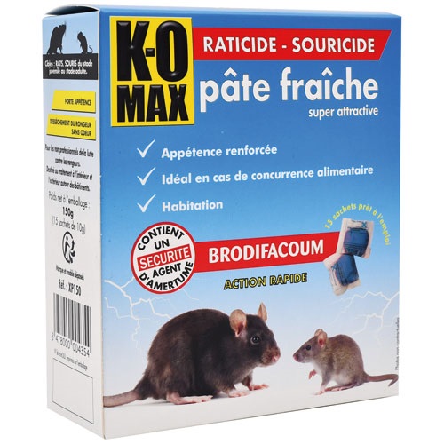 L'appât pâte fraiche rats et souris super attractif en boite de 150 g de chez K-OMAX présente une appétence hors du commun sur les rats et souris, et permet d’obtenir d’excellents résultats même dans les lieux à forte concurrence alimentaire. La matière active est très efficace contre les rongeurs résistant aux anticoagulants classiques. Ce mélange présente un traitement à coeur indispensable pour lutter efficacement contre les rats mais aussi contre les souris. Agit avec un effet retard et n’éveille pas la méfiance des rongeurs. Ils s’affaiblissent, s’éloignent de la colonie, se cachent et meurent en quelques jours. La matière active participe au dessèchement du rongeur et évite ainsi les fortes odeurs de putréfaction. Manipuler avec des gants pour éviter de transmettre l’odeur de l’homme. Déposer de préférence les sachets doses dans les cachettes accessibles seulement aux rongeurs. Appâter jusqu’à ce que la consommation cesse. Bien refermer la boîte après chaque utilisation. L'appât est prêt à l’emploi en sachets-doses. Sans odeur. Forte appétence. La boite en plastique est refermables, le couvercle est inviolable.