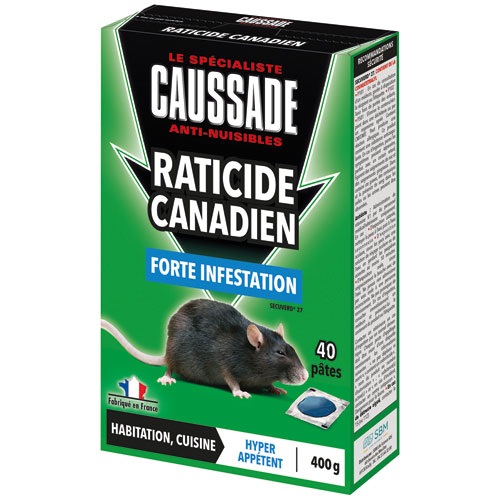 L'appât pâte raticide canadien pour forte infestation en boite de 400 g de chez Caussade est un anti-nuisible. Caussade propose une pâte dotée d'une grande appétence pour appâter et éliminer l'ensemble de la colonie. Spécial rats, forte infestation. Il est très appétent, idéal pour les lieux secs et/ou humides tels que l'habitation, entrepôt et cuisine. L'appât est prêt à l'emploi en sachets à utiliser dans des postes d'appâtage sécurisés et convenablement étiquetés. Ne pas ouvrir les sachets contenant l'appât.