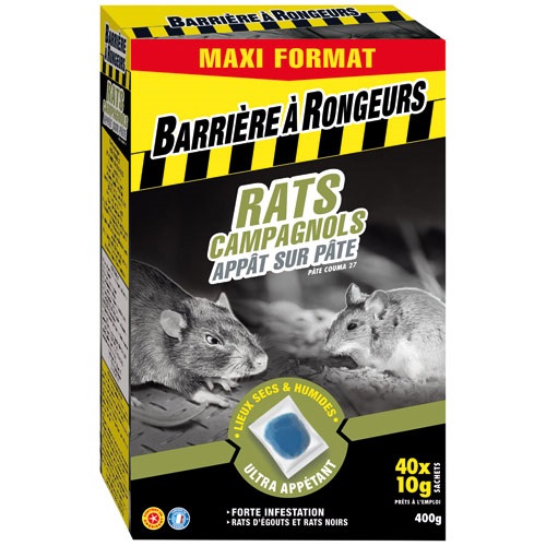 L'appât pâte rats et campagnols en 400 g de chez Barrière à Rongeurs est prêt à l’emploi conditionné dans des sachets individuels de 10 g pour éliminer les rats et campagnols, dans les lieux secs et humides. Les plus produits, une formule à base d’un anticoagulant de première génération, le coumatetralyl qui agit entre 3 et 21 jours après ingestion de l’appât sans éveiller la méfiance des autres rongeurs qui continuent à consommer le produit, une attractivité et appétence maximales.