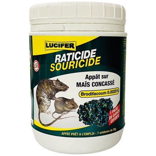 L'appât sur maïs concassé rats et souris en 140 g de chez Lucifer contient 0.001% de brodifacoum. Prêt à l'emploi en sachet unidose vendu dans un pot plastique refermable. Suivre les consignes d'utilisation, port de gants. Mettre les appâts à l'intérieur d'une boite à appâts pour la sécurité des humains et des animaux. La gamme des produits souricide, raticide proposés par Lucifer est une sélection de produits spécialement formulés pour éliminer les souris et les rats, deux nuisibles courants qui peuvent causer des problèmes dans les environnements domestiques, commerciaux et industriels. Ces produits sont conçus pour être efficaces, pratiques et sécuritaires lorsqu'ils sont utilisés conformément aux instructions. Voici une description détaillée de la gamme souricide, raticide. Formules efficaces, la gamme souricide, raticide propose une variété de formulations puissantes conçues pour attirer et tuer les souris et les rats. Ces formules peuvent être sous forme de granulés, de poudres, de blocs ou de liquides, chacune offrant une méthode d'application spécifique pour cibler les nuisibles.