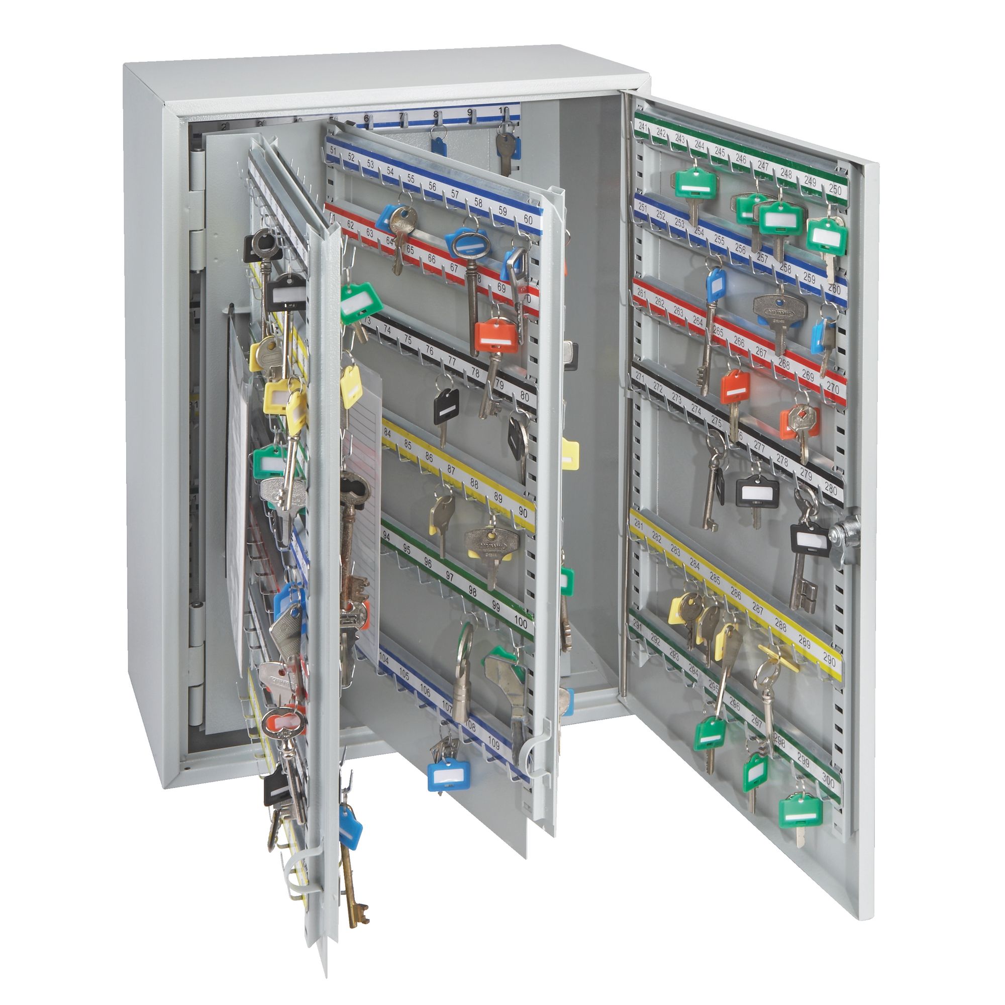 Corps en tôle d'acier épaisseur 1 mm. Revêtement laqué époxy gris clair. Serrure de sécurité à barillet (fournie avec 2 clés.) Barrettes d'accrochage réglables en hauteur avec bandes d'indexation numérotées. Système de classement à lecture directe avec répertoire intégré. Accrochage des clés sur panneau de fond et revers de porte. 2 volets rabattables supplémentaires. Fixation murale par vis (fournies).