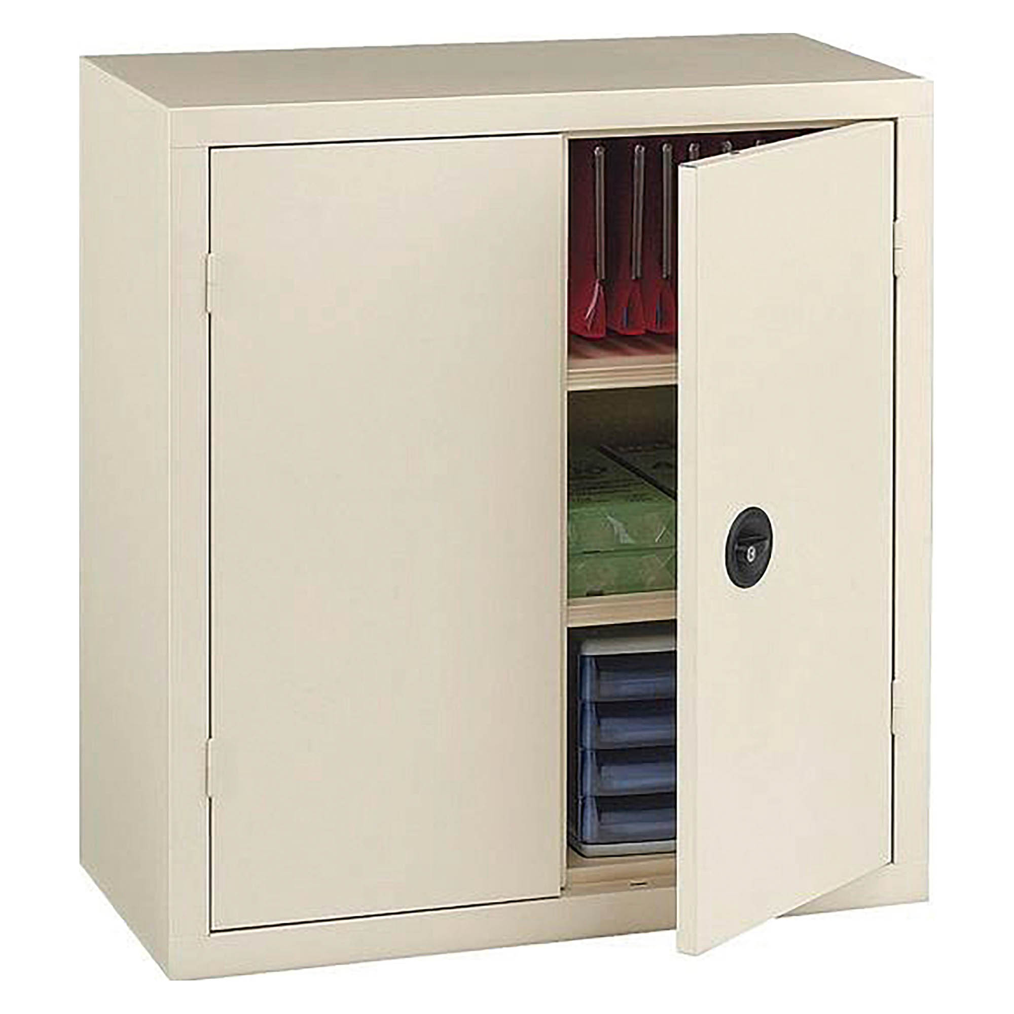 Tablettes assorties à la couleur du corps de l'armoire, réglables tous les 3 cm avec replis pour dossiers suspendus.