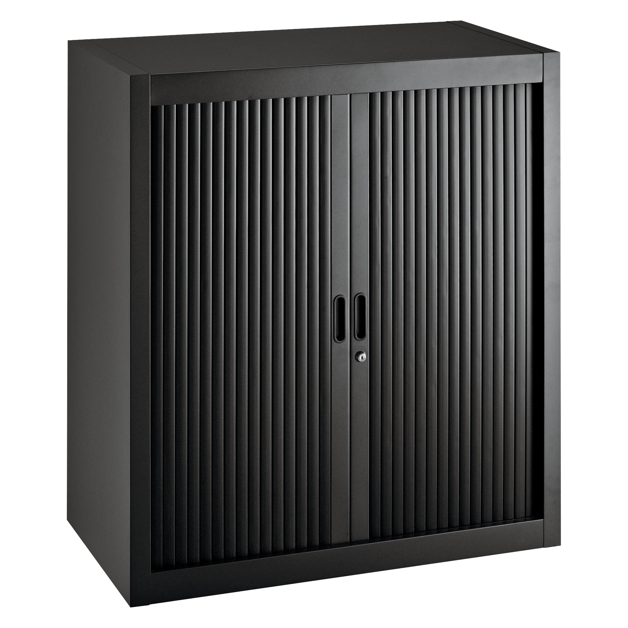 Equipement : tablettes noires réglables tous les 5 cm avec replis pour dossiers suspendus.