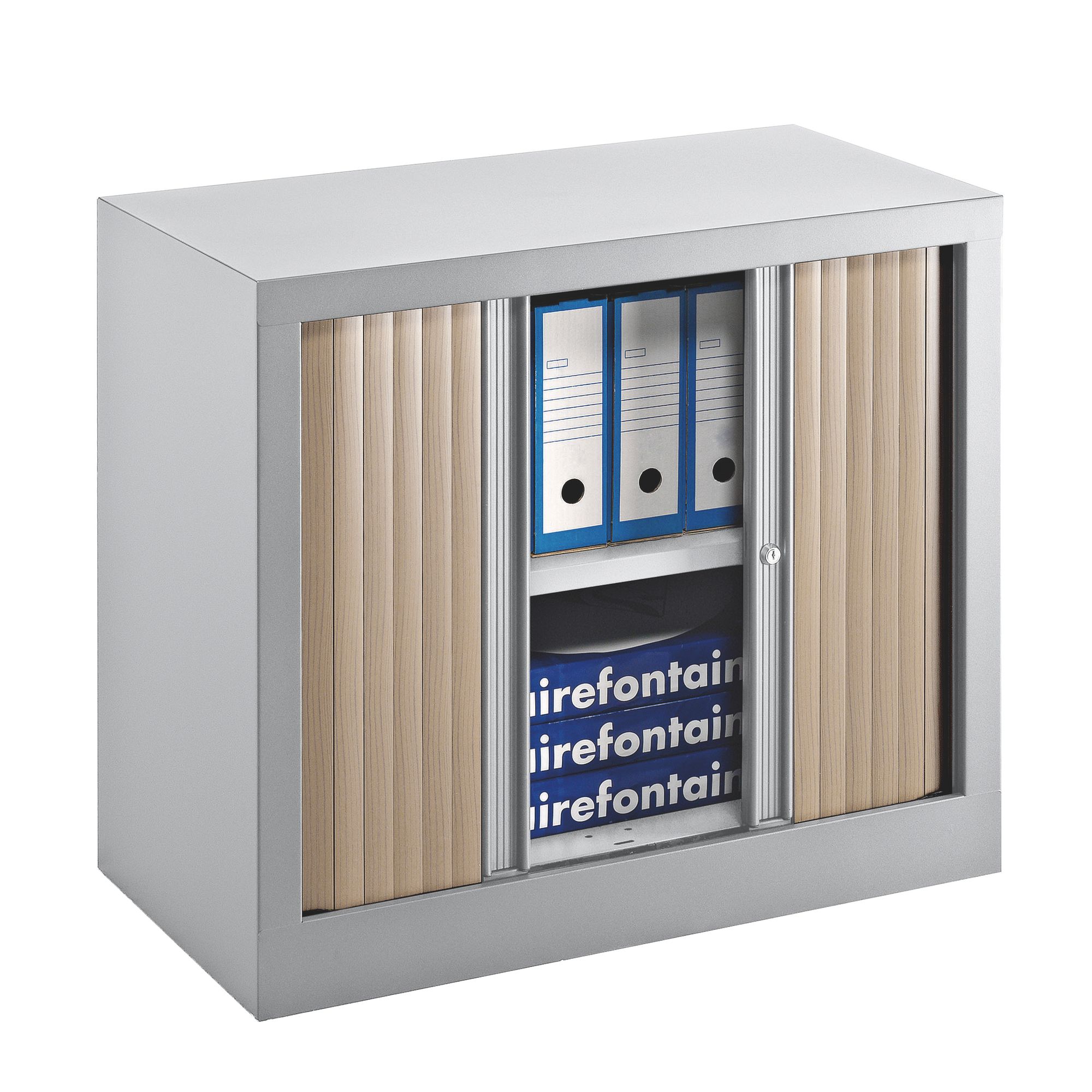 Fermeture : rideaux à lamelles polypropylène 30 mm non feu M3, s’escamotant totalement dans les parois latérales de l’armoire. Lame terminale acier profilé laqué époxy, coloris assortis au corps de l’armoire. Serrure (2 clés fournies dont 1 articulée).