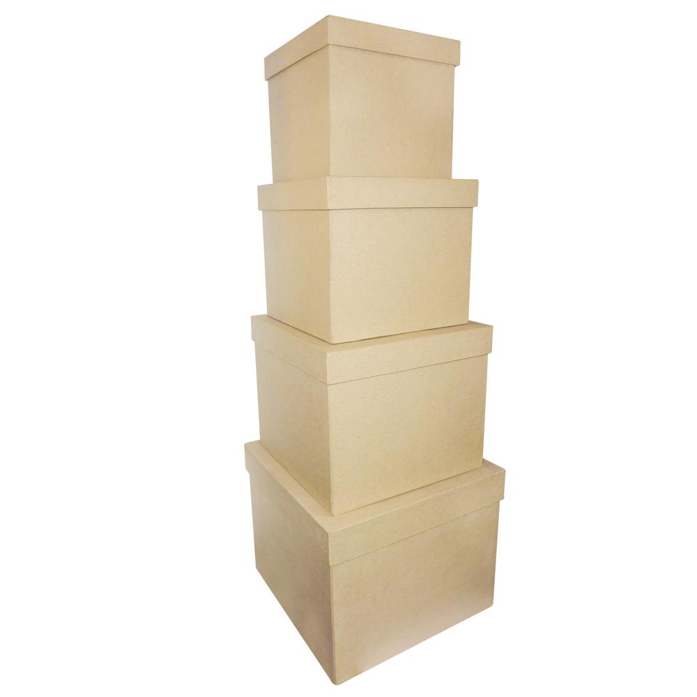 CARACTERISTIQUE : Ces boîtes sont fabriquées à la main à base papier mâché de couleur brun, chaque support est donc unique. Dimensions : Boite 1 16x16x14cm, boite 2 19x19x16cm, boite 322x22x18cm, boite 4 25x25x20cm.