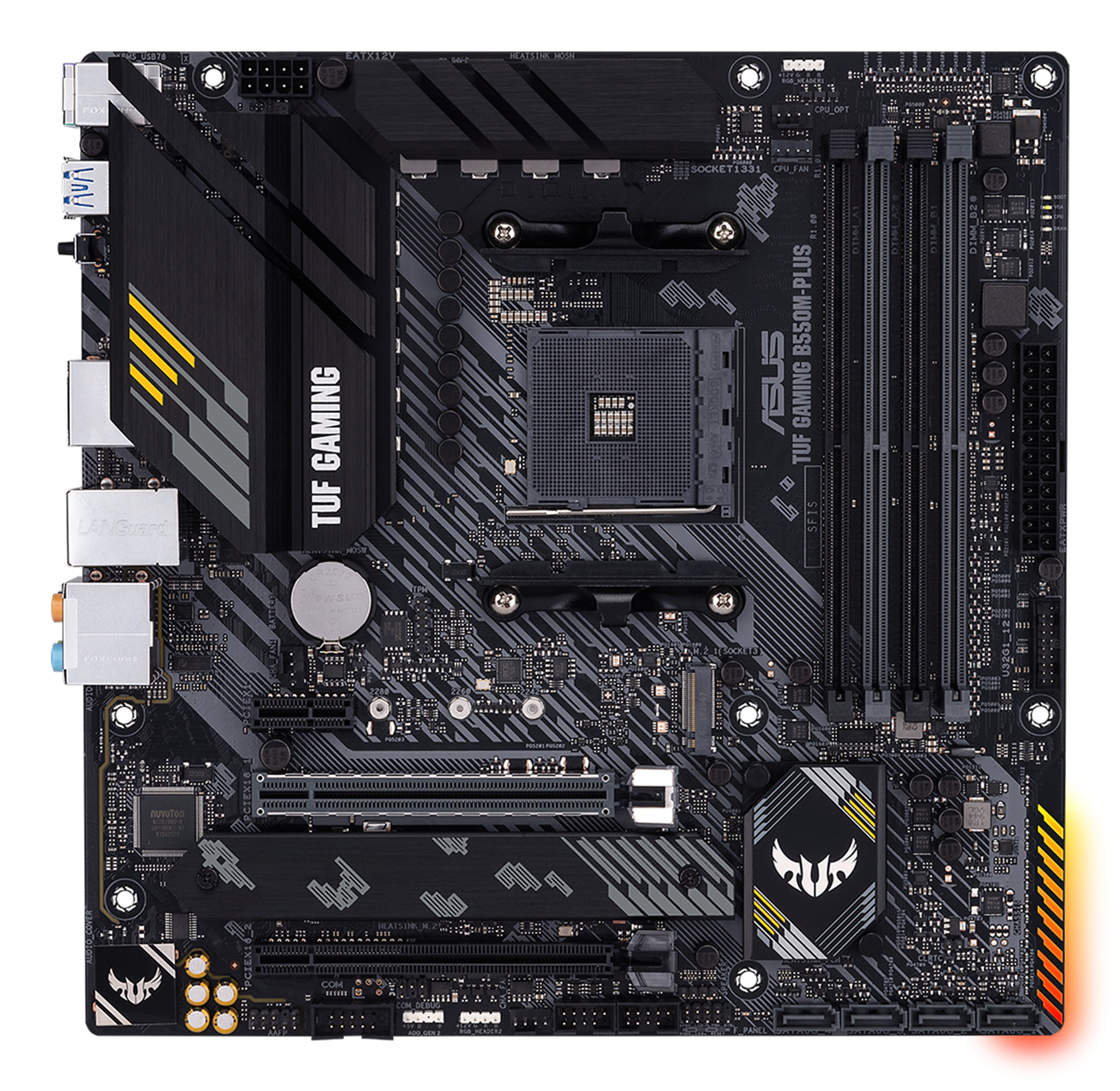 ASUS TUF GAMING B550M PLUS. Fabricant de processeur: AMD, Socket de processeur (réceptable de processeur): Emplacement AM4, Processeurs compatibles: AMD Ryzen 3000 Series. Types de mémoire pris en charge: DDR4-SDRAM, Mémoire interne maximale: 128 Go, Type de support (slot): DIMM. Interfaces de lecteur de stockage prises en charge: M.2, SATA. Technologie de Traitement en parallèle: 2-Way CrossFireX. composant pour: PC, Elément de forme de carte mère: micro ATX, famille de composant de produits: AMD
