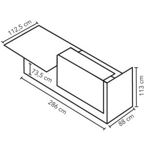 Dimensions hors-tout : H 113 x L 286 x P 112.5 cm. Dimensions premier plateau : L 140 x P 80 cm. Dimensions deuxième plateau : L 140 x P 112,5 cm. Dimensions comptoir : L 120 x P 35 cm