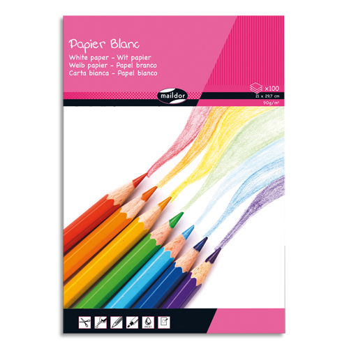Ce bloc de papier blanc est idéal pour la réalisation de dessins à la peinture, aux feutres et aux crayons. Le papier se colle, se plie et se découpe et confère un maximum de possibilités créatives. Ce bloc contient 100 feuilles de papier blanc 90g/m2 au format A4 (21x29 ,7cm). Excellent rapport qualité/prix.