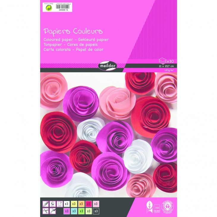 Ce bloc de papier couleur est idéal pour la réalisation de dessins à la peinture, aux feutres et aux crayons. Le papier se colle, se plie et se découpe et confère un maximum de possibilités créatives. Ce bloc contient 30 feuilles assorties de papier couleur 120g/m² au format A4 (21x29,7cm). Le papier est teinté dans la masse, recyclé et certifié Ange Bleu. Excellent rapport qualité/prix. L'assortiment se compose des couleurs suivantes : blanc (x3), jaune (x3), orange (x3), rouge (x3), rose (x3), violet (x3), bleu (x3), vert foncé (x3), vert clair (x3), noir (x3).
