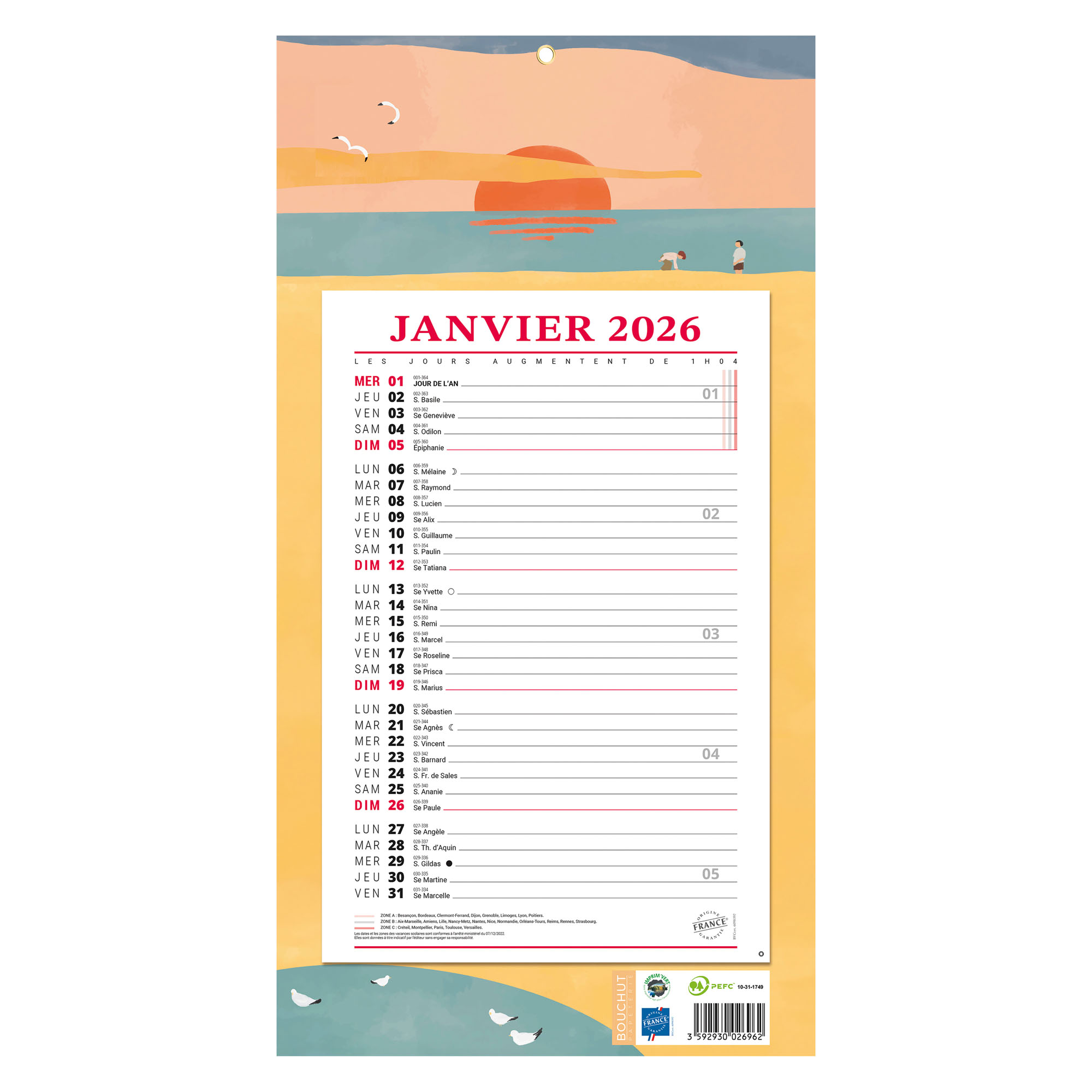 Carton fort contrecollé imprimé sur du papier. Œillet de fixation. 1 feuille par mois sur support avec dessins zen. Grille mensuelle avec congés scolaires. Format support : 19 x 36 cm. Format du bloc : 15,8 x 23,7 cm. Poids : 100 g. Les congés scolaires du dernier quadrimestre 2021 n’ont pas été communiqués par le ministère de l’éducation nationale aux fabricants. De ce fait, ils n’apparaissent sur aucun produit millésimé en vente sur le marché mais seront consultables sur le site internet « educ.gouv.fr » et relayés sur les sites internet des fabricants.