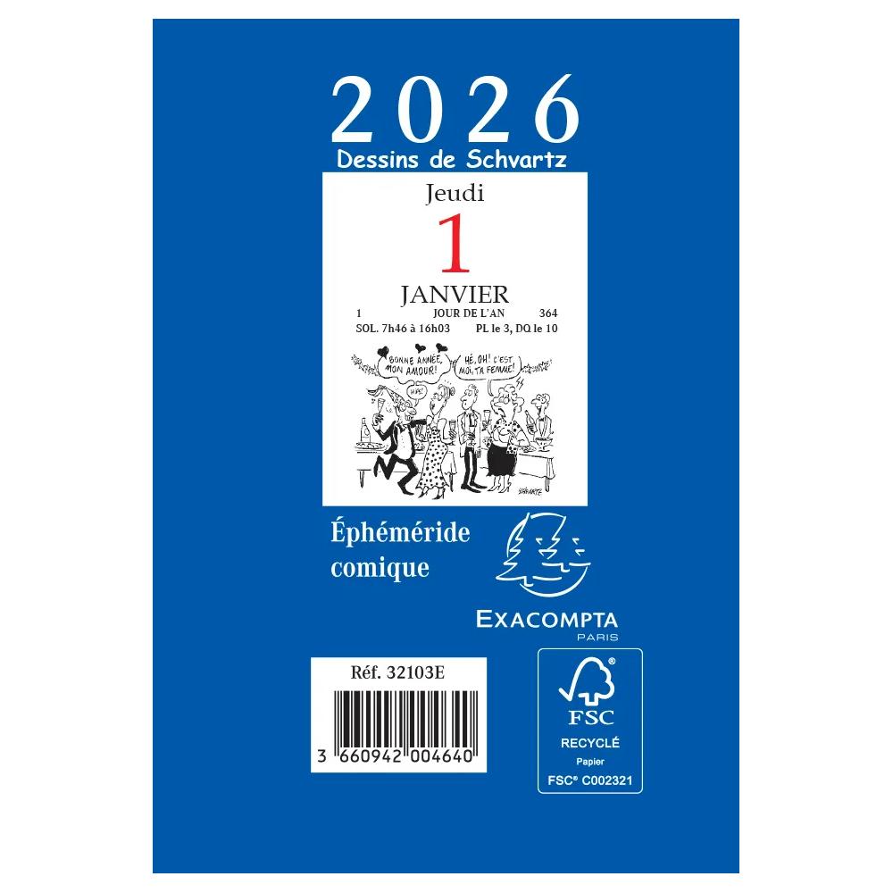 Bloc sous boitier plastique. Vendu seul (sans plaque murale). Un peu d'humour chaque jour avec les dessins de Loïc Schvartz. Date, saint du jour, numéro du jour et nombres de jours restants de l'année, heures de lever et coucher du soleil, phase de la lune. Certification : FSC - Imprim'vert (impression respectueuse de l'environnement).