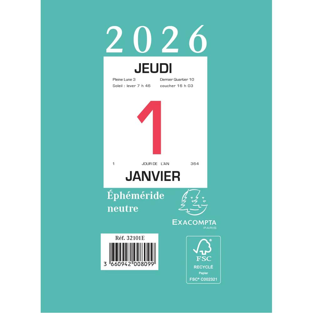 Bloc journalier, à effeuiller, sous boitier plastique. Vendu seul (sans plaque murale). Date, saint du jour, numéro du jour et nombres de jours restants de l'année, heures de lever et coucher du soleil, phase de la lune. Certification : FSC - Imprim'vert (impression respectueuse de l'environnement).