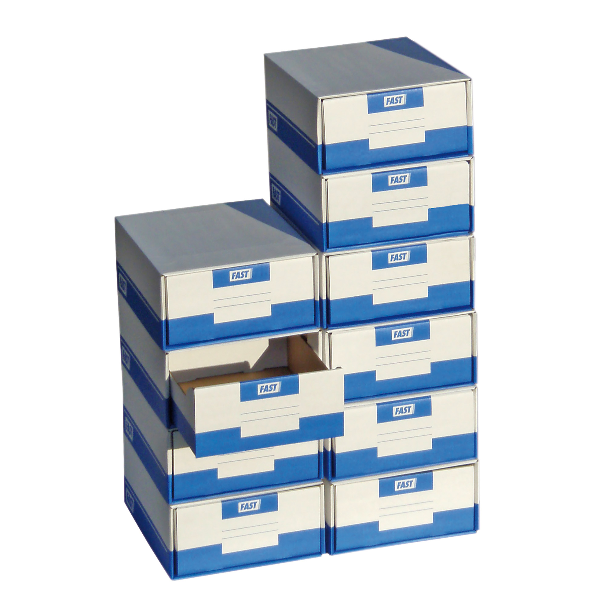 Boîtes et tiroirs en carton bleu et blanc. Superposition et juxtaposition assurées par 3 ergots de maintien.