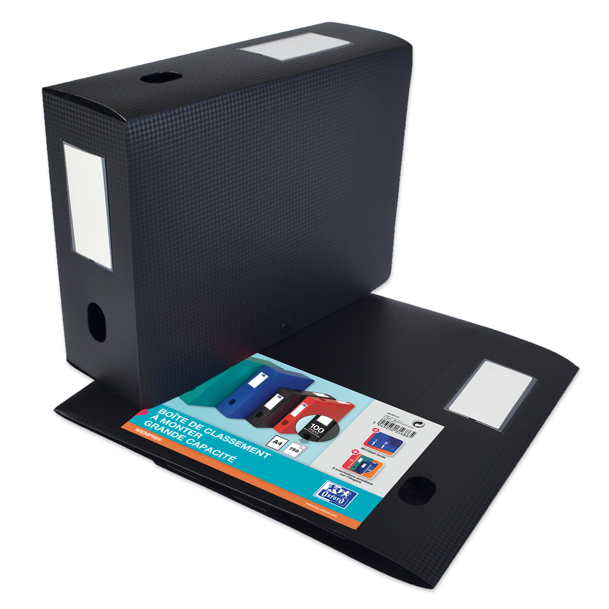 FERMETURE : Le contenu de la boîte de rangement plastique est sécurisé grâce au système de fermeture par un bouton pression noir. Les documents sont protégés et bien maintenus. PREHENSION : La boîte de rangement Memphis, livrée à plat, est dotée de deux œillets de préhension : Un sur le grand côté et l'autre sur le petit côté. La boîte est très maniable et elle est facile à sortir d'une étagère. CAPACITE : La boîte de rangement 24x32cm dispose d'un dos de 100mm et offre une très grande capacité de rangement car elle permet de stocker 750 feuilles en moyenne. Ce produit est disponible sous les versions de couleurs suivantes : - Bleu - Noir - Rouge - Vert