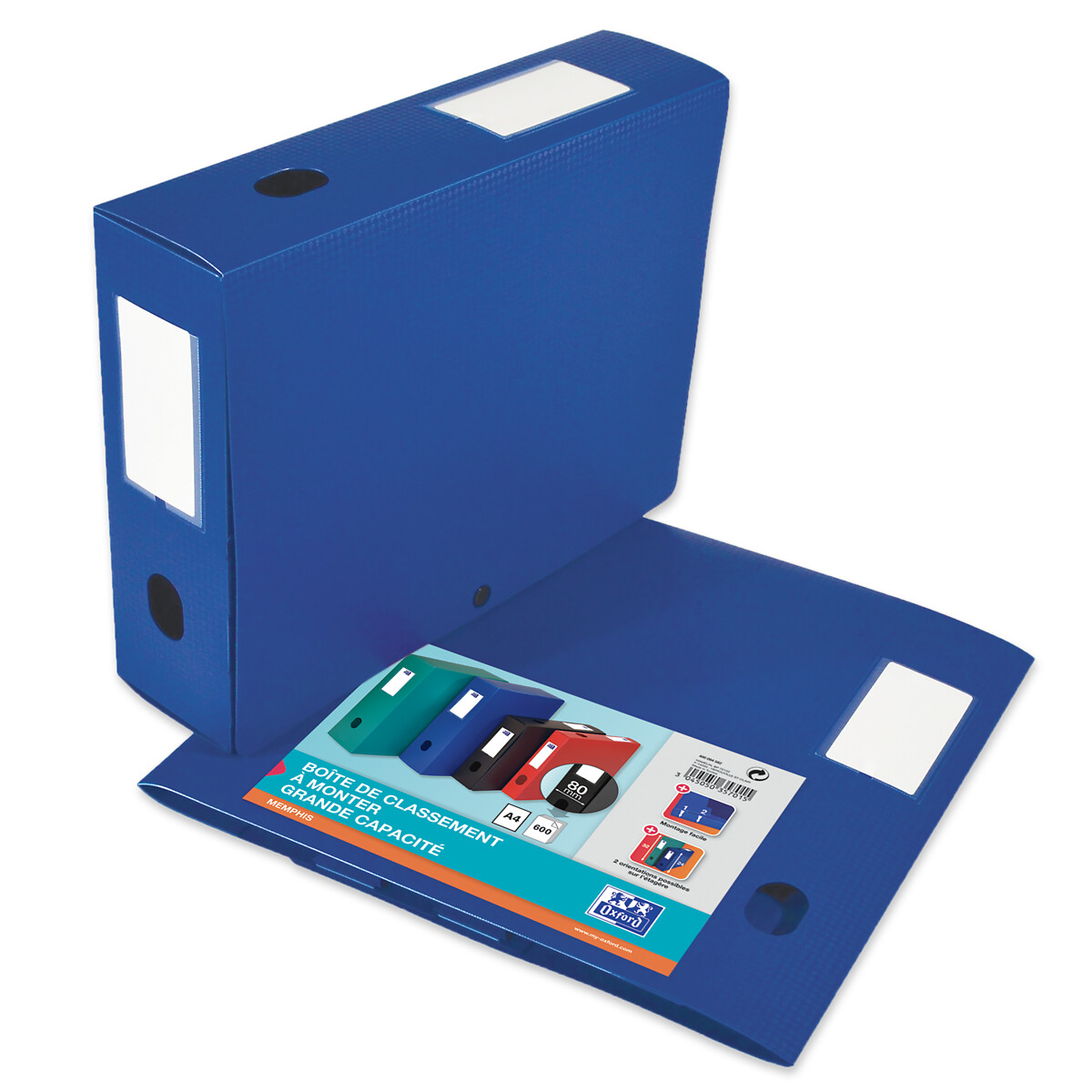 FERMETURE : Le contenu de la boîte de rangement plastique est sécurisé grâce au système de fermeture par un bouton pression noir. Les documents sont protégés et bien maintenus. PREHENSION : La boîte de rangement Memphis, livrée à plat, est dotée de deux œillets de préhension : Un sur le grand côté et l'autre sur le petit côté. La boîte est très maniable et elle est facile à sortir d'une étagère. CAPACITE : La boîte de rangement 24x32cm dispose d'un dos de 80mm et offre une grande capacité de rangement car elle permet de stocker 600 feuilles en moyenne. Ce produit est disponible sous les versions de couleurs suivantes : - Bleu - Noir - Rouge - Vert