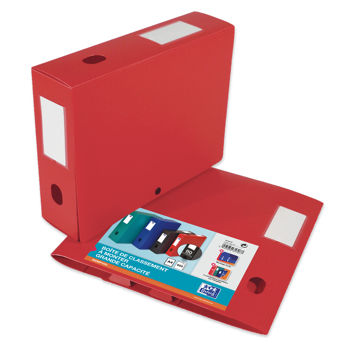 FERMETURE : Le contenu de la boîte de rangement plastique est sécurisé grâce au système de fermeture par un bouton pression noir. Les documents sont protégés et bien maintenus. PREHENSION : La boîte de rangement Memphis, livrée à plat, est dotée de deux œillets de préhension : Un sur le grand côté et l'autre sur le petit côté. La boîte est très maniable et elle est facile à sortir d'une étagère. CAPACITE : La boîte de rangement 24x32cm dispose d'un dos de 80mm et offre une grande capacité de rangement car elle permet de stocker 600 feuilles en moyenne. Ce produit est disponible sous les versions de couleurs suivantes : - Bleu - Noir - Rouge - Vert