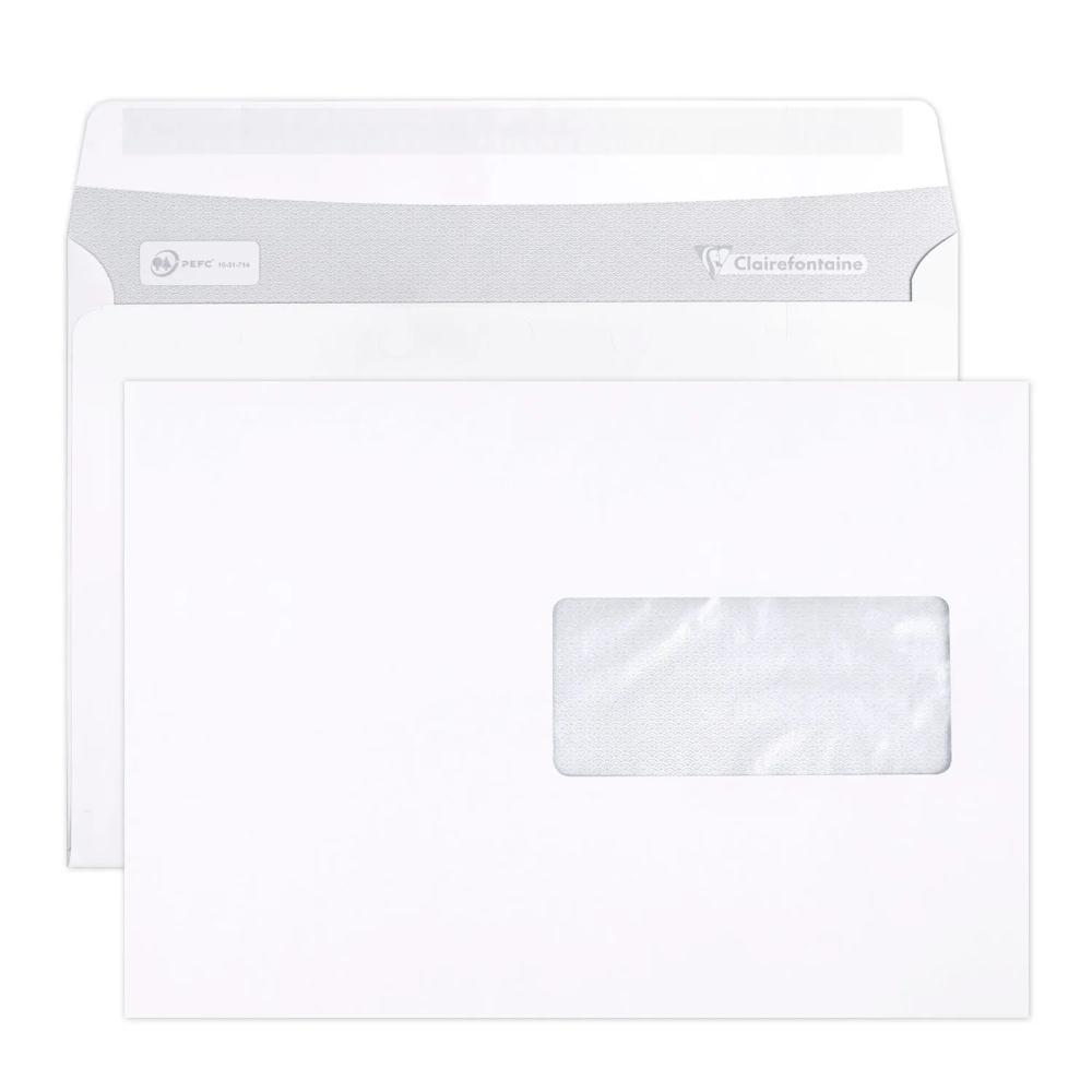 FORMAT : C5-162x229mm. Il peut contenir une feuille A4 (21x29,7cm) pliée en 2. CARACTERISTIQUES : enveloppe avec fenêtre Papier Cristal dimension 45x100 (position 62/20). Son fond est imprimé en gris, pour assurer la confidentialité de vos courriers. FERMETURE : Auto-adhésive, la colle est protégée par une bande siliconée, elle garantit une fermeture efficace et durable. CONDITIONNEMENT : En vrac par 500 dans une boite à charnière, elle facilite l'ouverture de la boite. Adaptée aux envois en nombre, mailing, publipostage .. PAPIER CLAIREFONTAINE 90g/m2 : Un touché supérieur et la garantie d'une grande blancheur. Certifié PEFC pour garantir une gestion durable des forêts.Fabriqué en France dans notre usine au coeur des Vosges.
