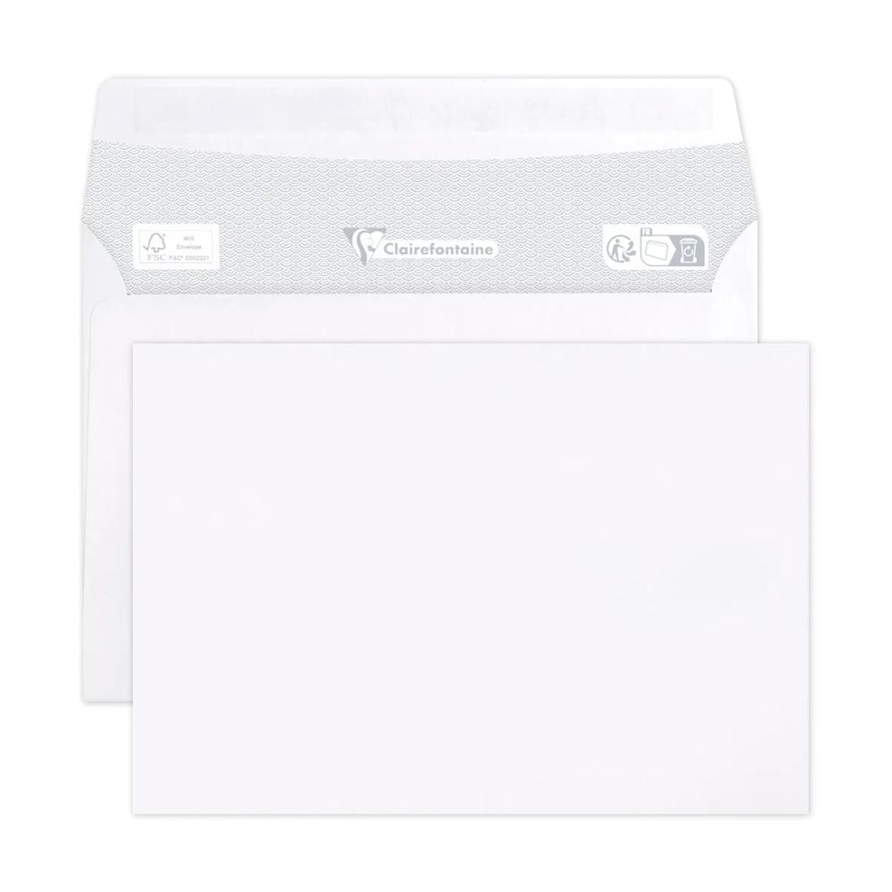 FORMAT : C6-114x162mm. Il peut contenir une feuille A4 (210x297 mm) pliée en 4. CARACTERISTIQUES : enveloppe sans fenêtre. Son fond est imprimé en gris, pour assurer la confidentialité de vos courriers. FERMETURE : Auto-adhésive, la colle est protégée par une bande siliconée, elle garantit une fermeture efficace et durable. CONDITIONNEMENT : En vrac par 500 dans une boite à charnière, elle facilite l'ouverture de la boite. Adaptée aux envois en nombre, mailing, publipostage .. PAPIER CLAIREFONTAINE 90g/m2 : Un touché supérieur et la garantie d'une grande blancheur. Certifié FSC pour garantir une gestion durable des forêts.Fabriqué en France dans notre usine au coeur des Vosges.