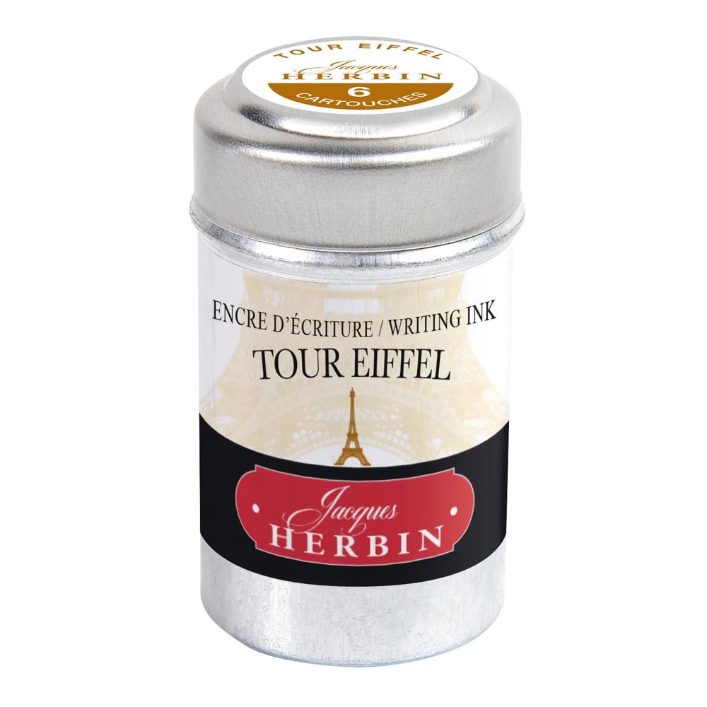Bienvenue à Paris ! Collection sur le thème de Paris, la ville où la maison Jacques HERBIN a vu le jour. Vous trouverez 5 couleurs d'encres d'écriture, développées spécialement pour cette gamme. Ces 5 encres Jacques Herbin vous promènent dans les rues de Paris pour une visite historique. Les toits de Paris, Le zinc participe au charme des appartements Haussmannien. Rue de la Verrerie, L'adresse de la maison Jacques Herbin en 1810. Moulin Rouge®*, Emblème de la fête parisienne et des savoir-faire français depuis 1889. Métro Parisien, Ses entrées qui sont reconnues comme des oeuvres d'art réalisées par Hector Guimard. Tour Eiffel, L'emblème de Paris. Boîte ronde en aluminium de 6 petites cartouches d'encre (format universel). Encres formulées pour un usage courant au stylo-plume et au stylo roller. Elles sont en effet finement filtrées afin de ne pas boucher les stylos. Ces encres sont principalement composées d'eau, d'humectant afin de limiter le séchage au niveau de la plume et de conservateur pour préserver leurs qualités dans le temps. Encre végane et fabriquée en France