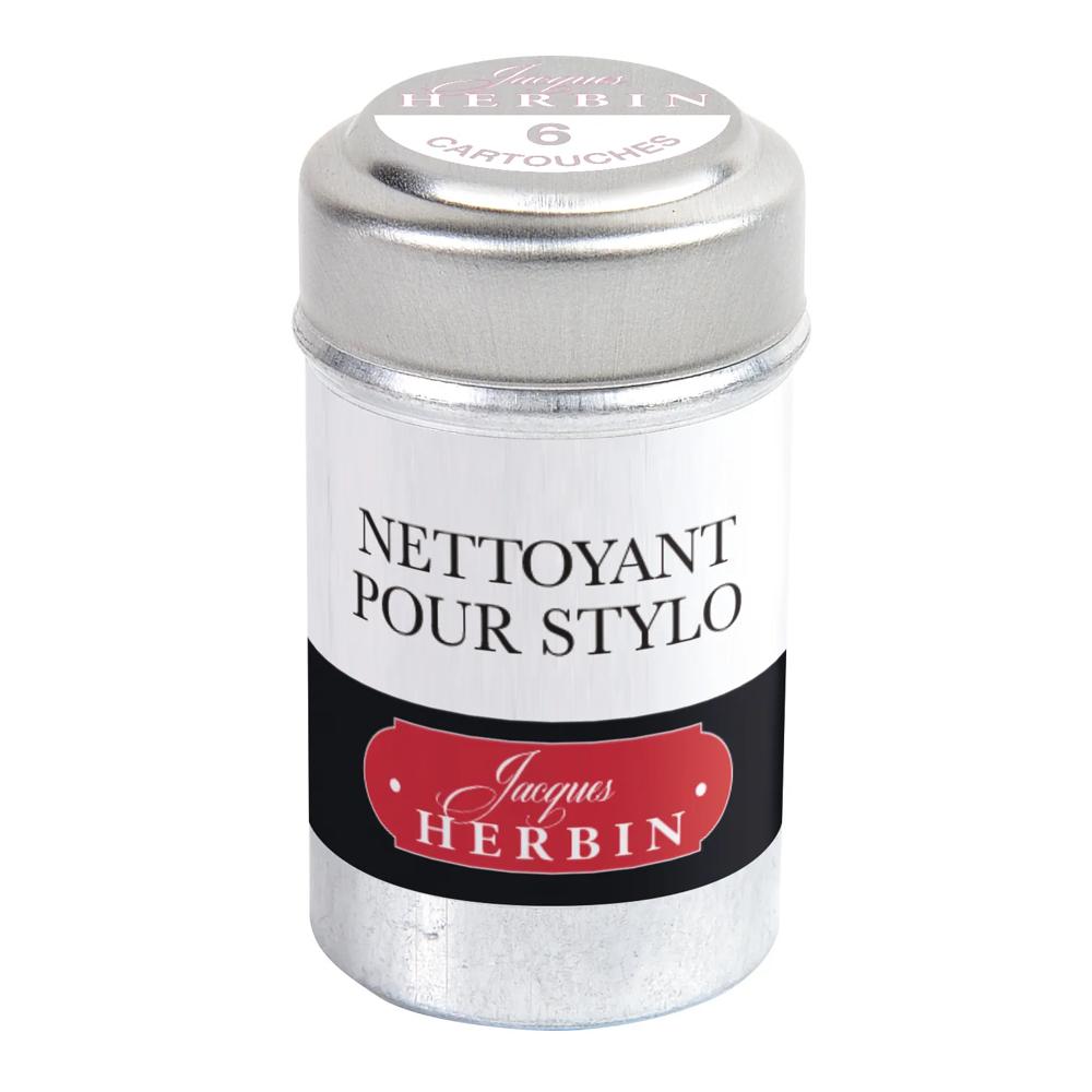 Boîte en aluminium de 6 petites cartouches nettoyantes (format universel) pour désencrasser facilement vos stylo-plumes, rollers et pompes. Livrée avec 1 notice d'utilisation. Nettoyant composé à partir de produits naturels. Biodégradable.
