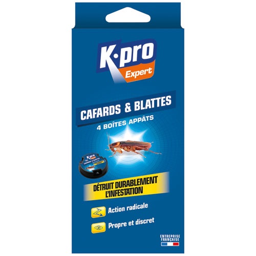 contaminer ces congénères. La mort survient dans les heures qui suivent l'ingestion. Idéal pour éliminer les cafards et blattes. Attire les insectes et détruit toute la colonie. Propre et sans odeur. Détruit durablement l'infestation. Jusqu'à 4 semaines d'efficacité. Cassez les ergots pré-découpés sur les côtés des boîtes pour permettre l'entrée des cafards. Disposez les boîtes appâts sur les lieux fréquentés par les insectes : endroits chaud, humides et obscurs tel qu'à l'arrière d'un réfrigérateur ou cuisinière, sous un évier, près d'une poubelle ou près d'une bouche d'aération. Pour une pièce de 10 m², en préventif, utiliser 1 boîte. En cas de faible infestation, utiliser 2 boîtes. En cas de forte infestation, utiliser 3 boîtes. Il est recommandé de changer les boîtes au bout de 4 semaines ou lorsque l'appât est totalement consommé. En cas de forte infestation ou pour une surface plus importante, multiplier le nombre de boîtes. Pour stopper l'effet biocide, retirer la boîte appât. K-pro Expert c'est des solutions ciblées du quotidien, développées d’après l’étude du comportement des insectes, pour éliminer rapidement tous types d’insectes et prévenir de la ré-infestation.