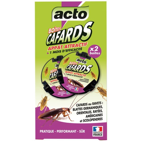 La boîte appât à attractif cafards et blattes en lot de 2 de chez Acto est prête à l'emploi. Cet appât de longue durée est pratique et sûr. Actif sur les cafards, ravets, blattes germaniques, orientales, rayées, américaines. Facile à mettre en œuvre, les boîtes-appât se placent sur les lieux de passage des blattes et dans les endroits chauds et humides . L’appât est très appétent pendant 1 mois. : ACTO boîtes cafards permet d’éviter tout contact de l’utilisateur avec l’appât. C’est un gel appât très appétent pour l’élimination des blattes. L’appât est composé d’ingrédients détectables à distance par les blattes facilitant ainsi un contact rapide avec le produit. Sa forte appétence permet une bonne ingestion du gel. Il agit en 24 heures après l’ingestion et élimine totalement les adultes en 4 jours. Simple d'utilisation, il suffit de retirer les trois ergots de la boîte-appât. Déposer les boîtes-appât dans les endroits chauds, humides et sombres (cuisine, salle de bains). En cas de forte infestation, renouveler le traitement tous les mois. Pour stopper l’action biocide, retirer les boîtes-appât des lieux traités. Stocker le produit entre 5 et 35°C. Craint le gel. Dose d'utilisation en préventif : 1 boîte pour 15 m², en curatif : 2 boîtes pour 15 m².