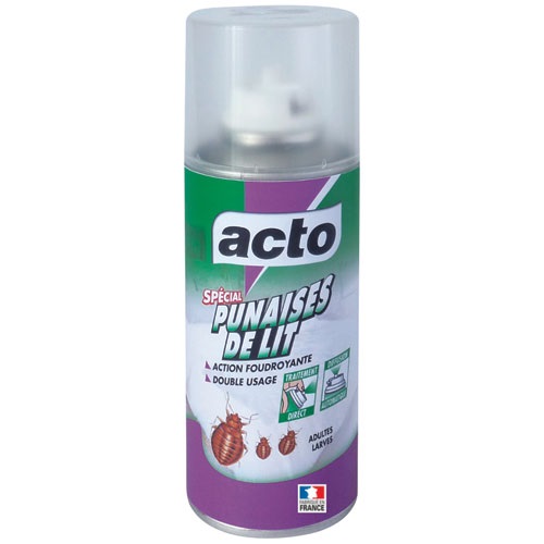 La bombe auto-diffusante punaise de lit de chez Acto en 125 mL est un aérosol insecticide inodore à diffusion automatique pour se débarrasser radicalement des punaises de lit. Insecticide spécial infestations, Acto punaises de lit élimine immédiatement, par son action foudroyante, les punaises adultes et leurs larves. Aérosol pour le traitement curatif, effet choc. Acto punaises de lit élimine également les œufs et les larves. Son action sur ces dernières est renforcée par un inhibiteur de croissance qui bloque le développement larvaire. Permet le traitement automatique d’un volume de 25 à 75 m3 environ (soit une pièce de 10 à 30 m²). Dose et mode d'emploi, fermez toutes les issues de la pièce (sauf celle par où doit sortir l’applicateur). Sortir aliments, animaux domestiques (chiens, chats, oiseaux, aquariums…) et plantes de la pièce à traiter. Bien agiter l’aérosol avant utilisation. Placer l’aérosol au centre de la pièce sur un tabouret protégé avec du papier. Enclencher le diffuseur avec le pouce, en appuyant fortement sur la languette. Elle restera bloquée en position de marche. Ne pas essayer d’interrompre la diffusion. Sortir de la pièce et empêcher toute personne d’y entrer. Laisser le produit agir pendant 2 heures. Aérer largement pendant 2 à 3 heures minimum puis aspirer les surfaces traitées avant de réoccuper l’espace. Ne pas utiliser la literie traitée dans les 12 heures après l’application. Renouveler le traitement 10 à 15 jours plus tard.