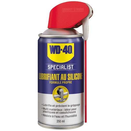 La bombe lubrifiant au silicone formule propre de 250 mL de la marque WD-40 SPECIALIST bénéficie d’une formule n’attirant pas les salissures et dotée d’excellentes propriétés lubrifi antes pour permettre le mouvement des pièces. Il assure à la fois une isolation contre l’humidité et une protection anticorrosion après un séchage rapide. Sa formule est compatible sur tous les métaux, plastiques, caoutchoucs et bois. Elle évite les frictions et le grippage des pièces mobiles avec de hautes performances en cas de fortes pressions. Ce produit résiste à des températures pouvant aller jusqu’à 200°C.