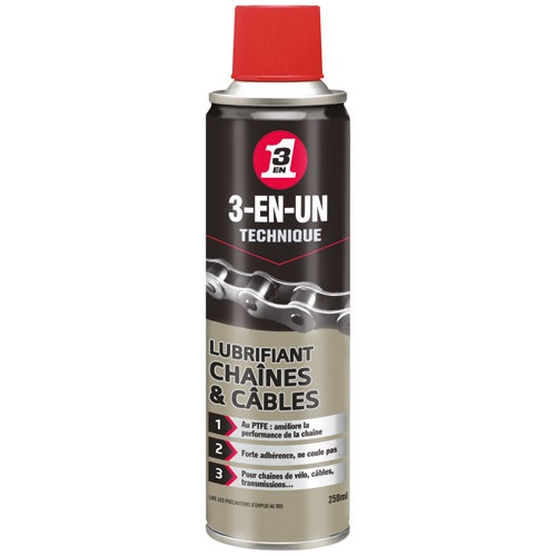 La bombe lubrifiant chaînes et câbles de 250 mL de la marque 3-EN-UN TECHNIQUE assure une lubrification haute performance sur la durée, évitant les points de friction tout en protégeant efficacement contre l'humidité et la corrosion. Sa formule renforcée en PTFE à base d'huile minérale et sans silicone ne coule pas grâce à sa forte adhérence et atténue l'attirance des salissures et poussières,