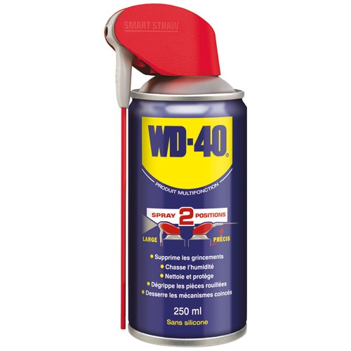 La bombe lubrifiant multifonction de 250 mL de la marque WD-40 est un composé spécialement étudié pour éliminer l’humidité et protéger tous les métaux soumis à différentes conditions pouvant impliquer une corrosion. Il agit également comme lubrifiant léger et libère, par imprégnation, tous mécanismes, roulements, agrafes, charnières, boulons, etc. même ceux pris en masse par la rouille.