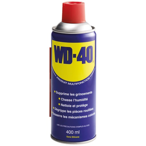 La bombe lubrifiant multifonction de 400 mL de la marque WD-40 est un composé spécialement étudié pour éliminer l’humidité et protéger tous les métaux soumis à différentes conditions pouvant impliquer une corrosion. Il agit également comme lubrifiant léger et libère, par imprégnation, tous mécanismes, roulements, agrafes, charnières, boulons, etc. même ceux pris en masse par la rouille.