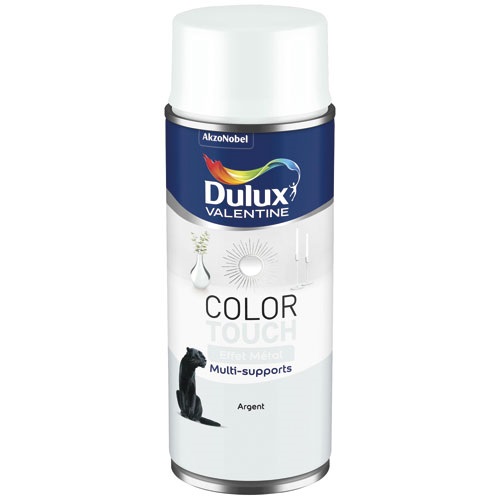 La bombe peinture Color Touch de 400 mL en coloris effet métal argent de la marque DULUX VALENTINE est la peinture idéale pour relooker tous vos meubles ou objets de déco en intérieur comme en extérieur. Ultra couvrante, elle s'applique facilement et directement sans sous couche sur la plupart des supports ( bois, osier, métal, acier, aluminium, verre, céramique, terre cuite, pierre, marbre, papier, carton, fibre de verre) ainsi que sur tous les plastiques rigides. Cette peinture dégage une faible odeur. Sa formule innovante à base d'eau permet une réduction de l'impact sur l'environnement. Pour la préparation les supports à peindre doivent être en bon état, propres, secs et sains. Pensez à masquer les parties à protéger. Ne pas utiliser à une température inférieure à 10°C ou près des sources de chaleurs. La qualité du résultat final dépend de la préparation des supports (neufs, métaux ferreux, anciens ou déjà peints). Pour l'application de la peinture, utilisez la bombe par temps sec, à l'abri du vent dans un endroit bien aéré et agitez bien la bombe pendant 2 minutes avant l'application. Pour un résultat homogène, tenez la bombe droite et agitez là régulièrement pendant l'application. Après utilisation, retournez la bombe et purgez la valve. Pensez à garder la bombe de peinture dans un endroit sec et à l'abri du soleil, du gel et des sources de chaleur. La résistance de la peinture est obtenue après 28 jours de séchage.
