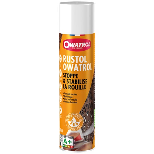 La bombe vernis anti-corrosion Rustol de 500 mL en coloris transparent de la marque OWATROL est un vernis solvanté à base de résines alkydes et d’huile végétale. Sa grande fluidité lui confère également d’excellentes propriété de primaire ou d’adjuvant. Ce vernis peut être aussi bien utilisé en intérieur qu'en extérieur en tant que antirouille, base d'accrochage sur supports difficiles ou en tant qu'additif pour les peintures, les lasures, les vernis glycérophtaliques et alkydes-uréthanes. Il s'applique sur les métaux ferreux et non ferreux, les plastiques, le verre, le bois ou les anciennes peintures. Ce vernis est un antirouille transparent à grand pouvoir mouillant qui chasse l'air et l'humidité du support et qui peut s'appliquer directement et facilement, sans sablage ni ponçage, sur la rouille saine en formant un film protecteur, isolant et souple. Il conserve ainsi l'aspect rouillé des supports tout en les protégeant. Prêt à l’emploi, ce vernis n'a pas besoin d'être diluer, donne un aspect brillant et à un rendement de 15 à 20 m² / L. Son temps de séchage au toucher entre 12 et 24 heures et peut être recouvrable en 24 heures. Ce vernis peut être recouvert par toutes les peintures de finition à liant gras type glycérophtalique ou à base de résines alkydes-uréthanes. Dans le cas de peinture glycérophtaliques en phase aqueuse, prévoir 5 jours de séchage à 20°C. Ne peut pas être recouvert par des peintures acryliques, bicomposants ou à séchage rapide.