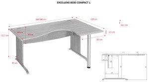 Plateau avec angle à 90° en panneaux de particules mélaminés antireflet. Épaisseur 25 mm. Passe-câbles coloris aluminium intégrés au plateau. Voile de fond. Chants droits antichocs ABS, épaisseur 2 mm. Piètement "L" avec pied de renfort métal : diamètre 6 cm.