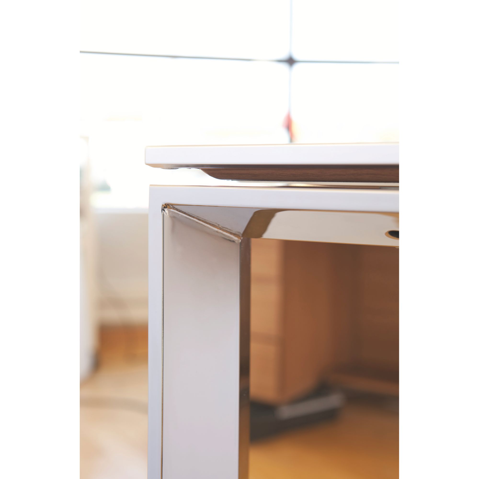 Structure métal chromée, piétement section trapézoïdale 94 x 30 mm, longerons sous plateau section rectangulaire 10 x 4 cm.